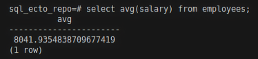 HR.Employee |> select([c], avg(c.salary)) |> HR.Repo.all()
