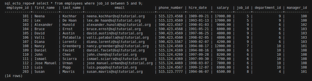 The above code will check for employees whose job_id falls within the range of 5 to 9. It matches exact values.