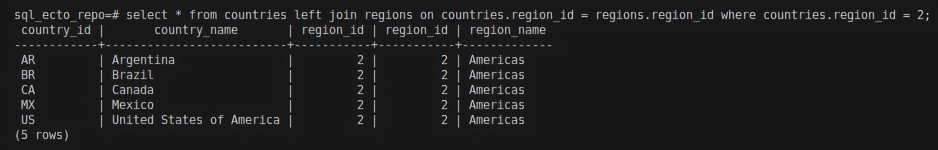 iex(2)> HR.Country|> join(:left, [p], r in HR.Region, on: p.region_id==r.region_id ) |> where([p], p.region_id==2 ) |> select([p, r], [p ,r] ) |>  HR.Repo.all()