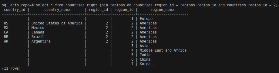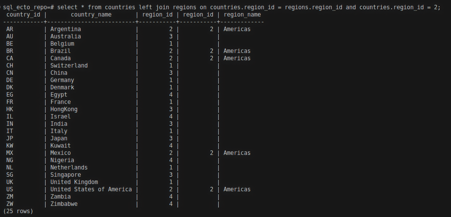 iex(3)> HR.Country|> join(:left, [p], r in HR.Region, on: p.region_id==r.region_id and p.region_id==2 ) |> select([p, r], [p ,r] ) |>  HR.Repo.all()