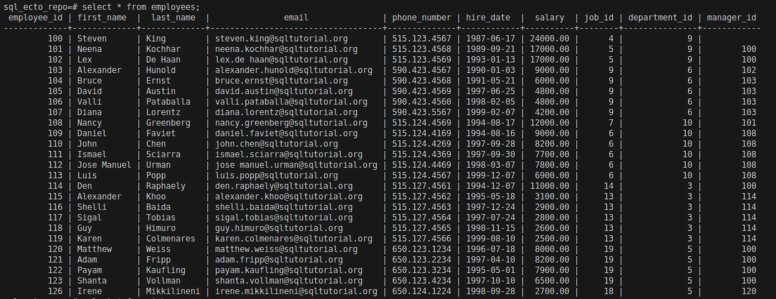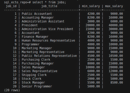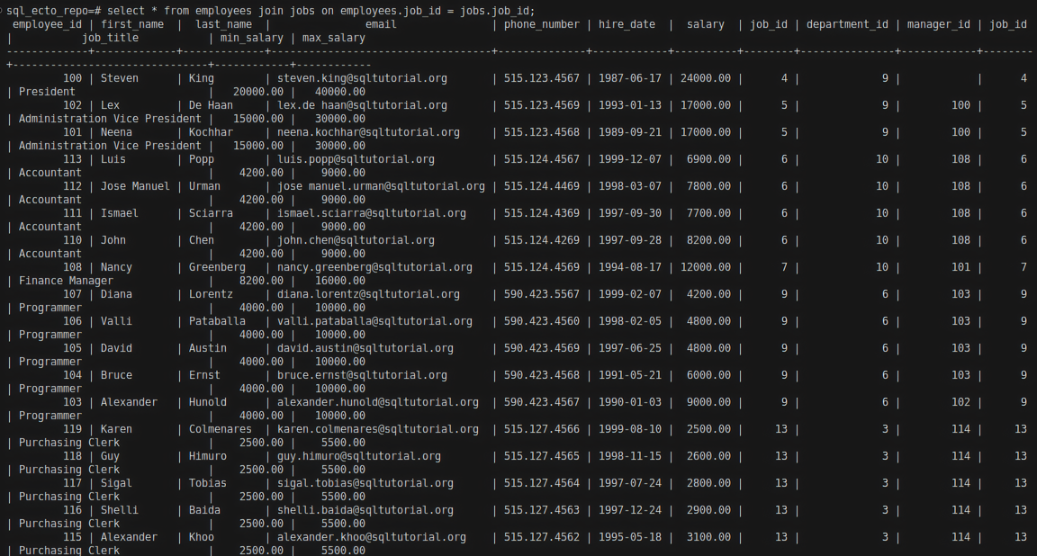 In the above table, you can see that both employees and jobs are joined together, with all the columns appearing.
