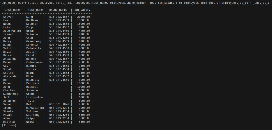 In the above example, we are selecting only first_name from employees, last_name from employees, phone_number from employees, and min_salary from jobs.