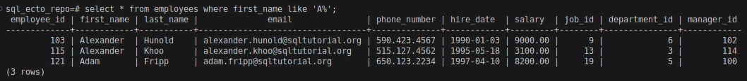 On the above code, like(c.first_name, "A&") will search for employees whose first_name starts with A followed by any characters or numbers. Here [c] is the reference variable that is used to refer to HR.Employee. Refer Aliases in Ecto to learn about aliases/reference variables.