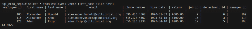 IEx(27)> HR.Employee |> where([c], ilike(c.first_name, "a%")) |> HR.Repo.all()
