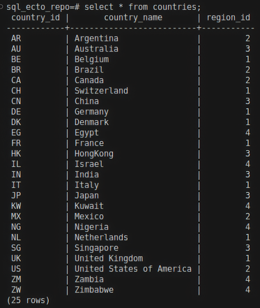 Here, we are selecting region_id from HR.Country and assigning it to a variable called region_id_from_country. Here c is the reference variable; refer Aliases in Ecto to know about reference variables.
