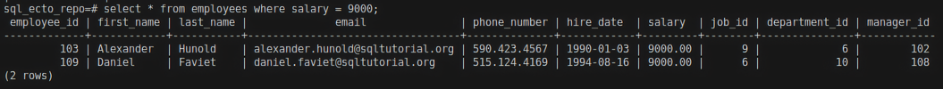 IEx(26)> HR.Employee |> where([c], c.salary == 9000) |> HR.Repo.all()
